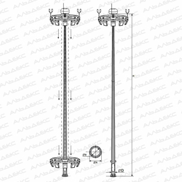 Высокомачтовые опоры освещения, предназначенные для монтажа большого количества светильников (до 12) на высоте, позволяющей увеличить их продуктивность и площадь охвата. Опоры ВМО-16-В исп. 5 заменяют собой сразу несколько стандартных опор освещения, что позволяет полностью окупить их увеличенную стоимость, связанную не только с большой металлоемкостью, но и со сложной организацией конструкций. При этом такие металлоконструкции отличаются оптимальным для своих габаритов весом, не создают излишней нагрузки на грунт, могут быть использованы для подземного подвода кабельной системы, что позволяет отказаться от протягивания дополнительных проводов. Системы используются на стадионах, на промышленных площадках и т.д. Их гармоничный дизайн и современное исполнение, а также возможность обслуживания без привлечения габаритной спецтехники, которой часто требуется специальный подъезд, позволяют использовать их при обустройстве жилых комплексов.