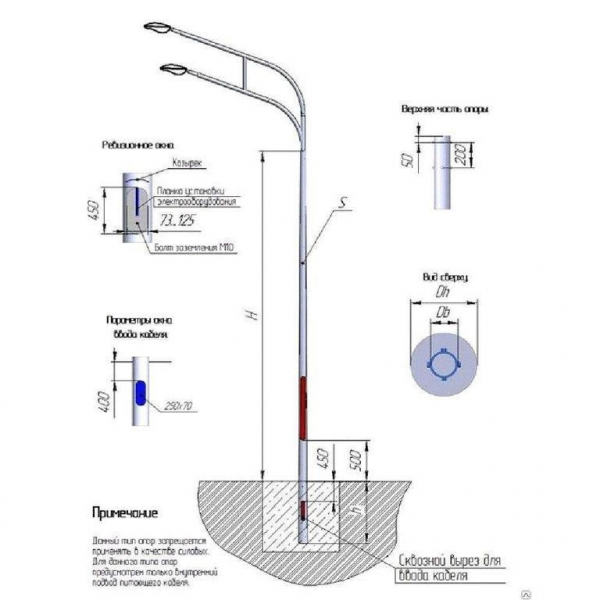 Подвод кабеля производится внутренним, подземным способом. Внутри опор прокладывается питающий кабель, доступ к оборудованию обеспечивается через ревизионный люк.