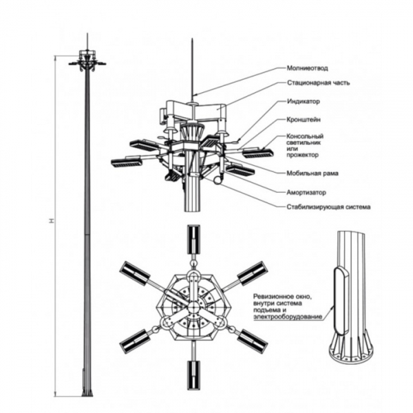 Высота высокомачтовых опор МГФ 25 метров. Их грузоподъёмность составляет до 500 кг. Количество прожекторов в каждой опоре — до 6 штук.